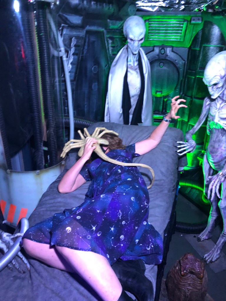 The Pine Bush UFO and Paranormal Museum held its reopening a few weeks earlier, but tons of visitors headed inside, me and my friends among them. Earlier in the year, I did a tiny bit of consulting with them and was curious to see what came of the place. The town took over a storefront building and transformed it into a collection of exhibits done well on a tiny budget. The guides took us through the galleries and spoke of the numerous sightings, noises, earth trembles and other unexplainable phenomena. There were pictures, videos and a few artifacts, as well as interactive exhibits. It also seems there’s a gathering of Sasquatches hanging about in the Hudson Valley woods. An outbuilding is home to a small paranormal exhibit, also containing creepy artifacts, helpfully explained by a video that details the origin stories behind the haunted items.