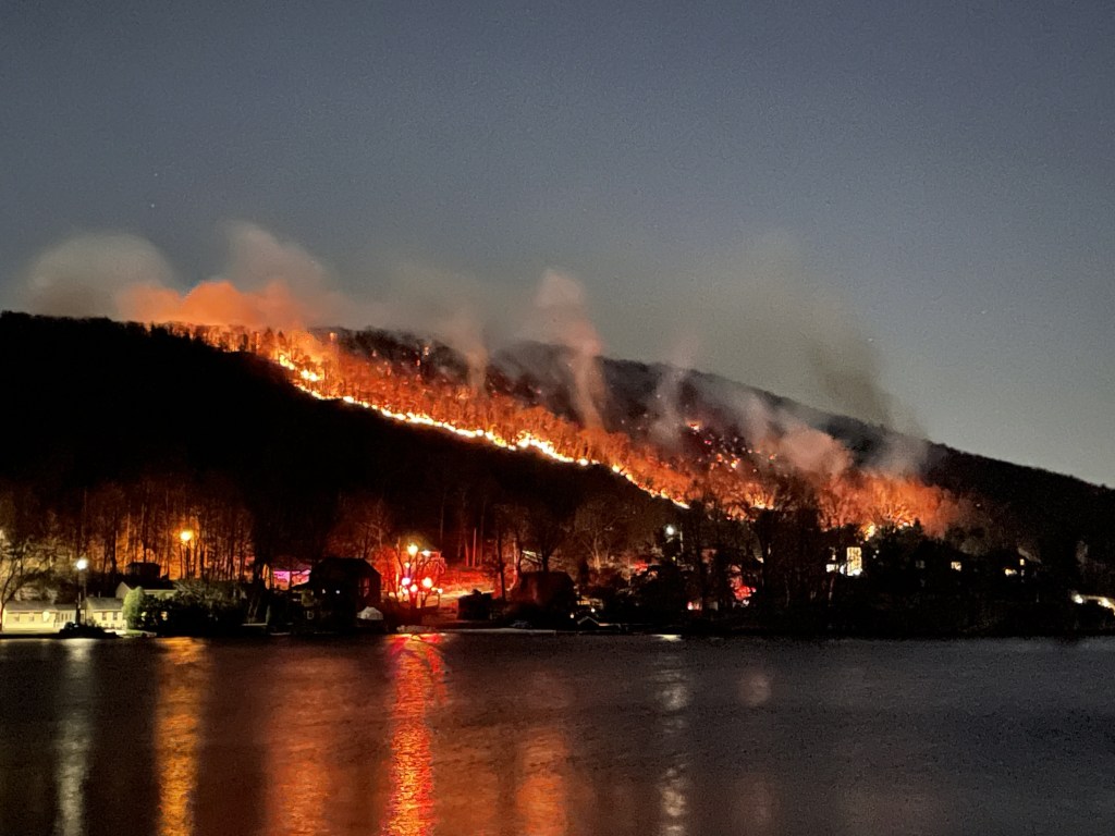 The next day I stayed in bed until noon. I checked my phone. The fire spread to 5300 acres. Now our town had fire companies from six states (at least 60 companies, at last count), the New York DEC, the NY/NJ Forestry Service and the Army National Guard. Professional fire jumpers from Montana and Colorado arrived, highly skilled at tackling forest fires. Chinook and Blackhawk helicopters joined the battle to fight the flames. It was encouraging, though they only managed to contain 10% of the fire.