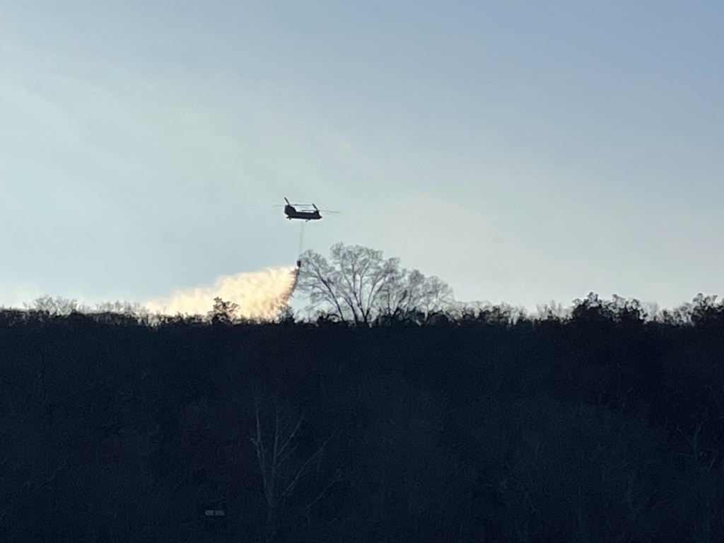 On my morning walk, I’d heard the sound of the above helicopter approaching. It made for a glorious sight, emptying its water basket over the fire, backlit by the rising sun. It was beautiful.