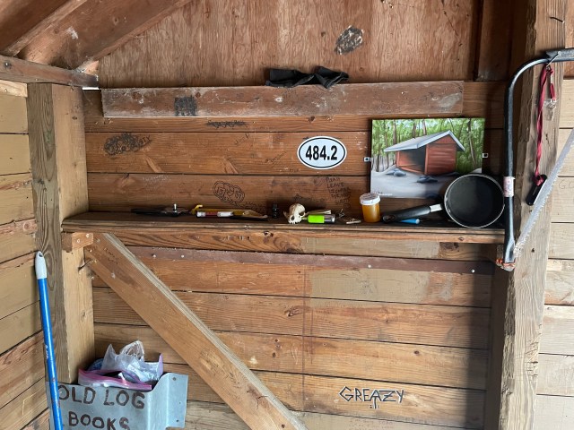 After two hours, we reached a shelter. It’s a three-sided, roof-topped structure that’s meant to give hikers a bit of a break from sleeping directly on the ground. There’s an outhouse, a bear box, a picnic table and a campfire ring near it. Inside the shelter, there’s a log where hikers can write their names, where they’re from and where they’re headed (not all complete the AT). Some have left a few scattered odds and ends inside. I especially loved the painting and the animal skull!